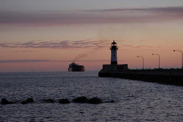 James R. Barker approaching the Duluth North Breakwater Lighthouse and canal entrance, Duluth, Minnesota