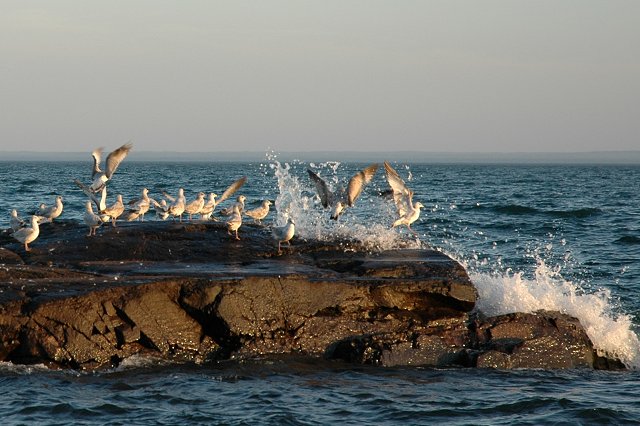 Seagulls surprised by lake Superior wave, Brighton Beach, Duluth, Minnesota